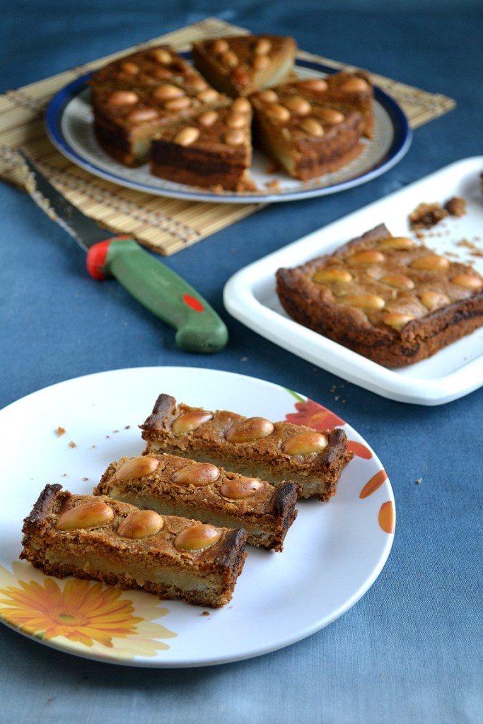 The next month of Daring Bakers reveal date has arrived and I am feeling so lazy to draft a post. But as I finished the challenge two weeks before and the snaps are all ready, I had to do it. This month’s challenge is a traditional dutch pastry hosted by Francijn of Koken In De Brouwerij. She is a Dutch baker and she challenged us with Gevulde Speculaas which means Stuffed Speculaas. The pastry has an almond filling. The dough has a spice powder which is called as the Specullaask Ruiden (Speculaas spice mix), which can be bought in a store if you live in Netherlands. But as I reside in Madurai, I opted to prepare my spice powder according to Francijn’s recipe. This spice powder is so versatile and can be used in cakes, muffins, cheeses cakes and so on.. The almond pate has egg in it and so I substituted egg with curd. The filling went very thin and so I added 2 tbs of flour to make it little bit thick. Once baked it firmed up and it was so delicious. You can make the filling and the dough the previous day and can assemble and bake it the next day. I didn’t have a large tin so I ended up with a circular speculaas baked in a loose bottomed pan and a rectangular speculaas baked in a loaf tin. The pastry was flaky and the filling was soft. This is the first time I am hearing about this pastry and was very thrilled to get it right. I am giving the spice mix proportion for the exact amount of the powder required in the recipe. If you are going to prepare and store it then make all the teaspoon measures into table spoon measures and increase cinnamon to 4 tbs.