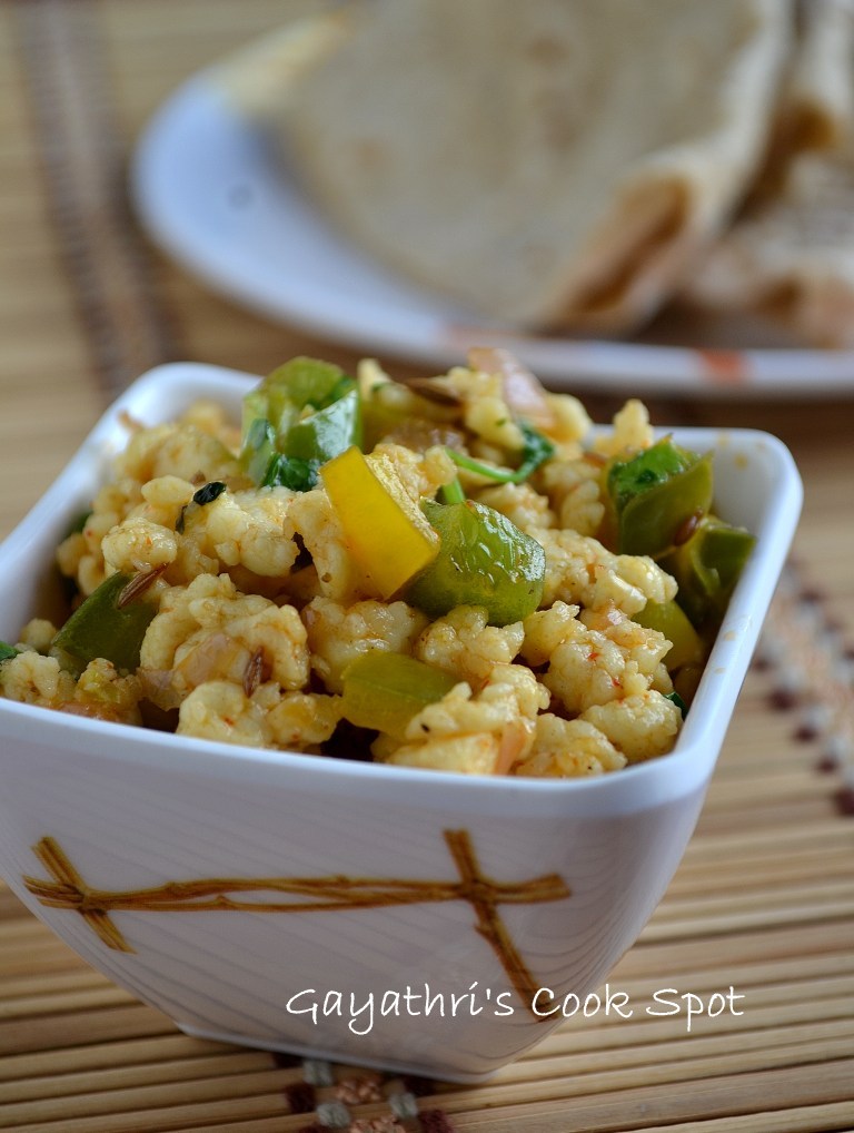 2. When theu crackle add the capsicum pieces and saute for a minute.