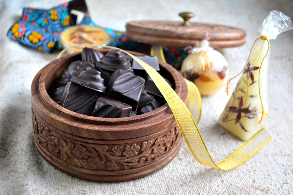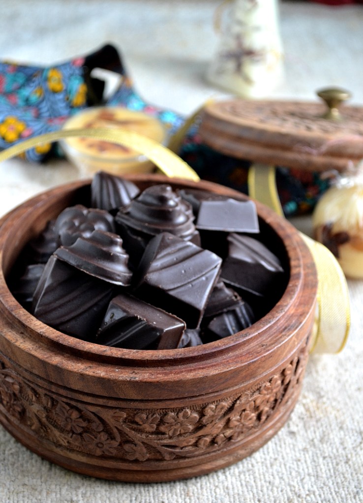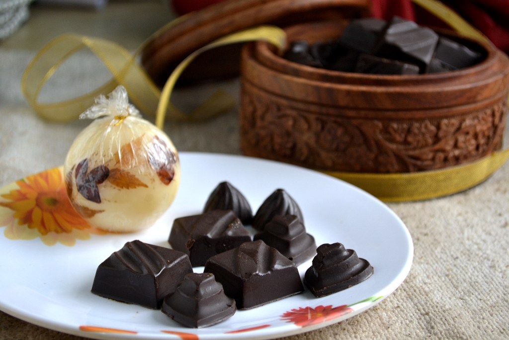 Advance Valentine”s day wishes to all my readers. Valentine’s day is not complete with out a box of chocolate and it will be very special if we make it at home. I had some chocolate moulds which I bought long back but never had a chance to use it. So I decided to make chocolate with jam filling and some nutties to celebrate this day. Tomorrow is also my twin brothers’ birth day. So to celebrate both the days, I made a batch. I had a tough time taking a snap of these cuties because my daughter wouldn’t let the box go.