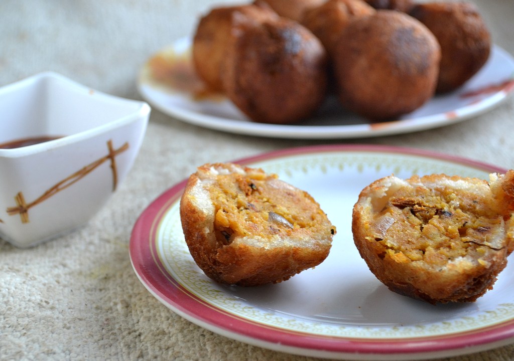 When my brother was in college, he used to bring his friends home and mom would make delicious bread rolls for all. They were great fans of mom’s cooking and this tradition followed when I went to college. When I bought home sweet potatoes, I had a different plan. But I completely forgot about those potatoes after a day and when I saw the potatoes lying in the pantry, I decided to make bread rolls what mom used to make with a little change. Mom usually prepare bread rolls with potato and I substituted it with sweet potato. Sweet potatoes have a lot of fibres and so after cooking and peeling, I couldn’t add it directly to the filling. I had to pass the cubes through a wire mesh to get rid of the fibres. The filling tasted wonderful with a little hint of sweetness from the sweet potato. Preparing the bread slice is very important in making these rolls. Just dip one side of the slice in water and remove immediately. You don’t want to end up with a soggy bread. Place the slice in one palm and press it with your other palm to extract all the water from it. If water remains in the slice, then the rolls will end up soggy. Wet bread can be shaped easily whereas the dry bread will crumble while shaping. If you don’t like the crust, then you can remove it before dipping the slice into water. But I love the extra crispy crust in the rolls so I didn’t remove it. Take care to extract all the water from the bread before placing the filling. I learnt it the hard way…