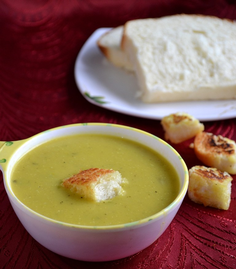 For the second day of Blogging Marathon #26 week 1, the ingredient I have to use in either soup or salad is lentil. I have never tried to make a lentil based soup so far. So when I browsed the web, I came up with many soup recipes using moong dhal. One is this Dhal Sorba, the Indian version of soup. It is mild in flavour and when paired with croutons it made a filling breakfast. My daughter never relishes soup as it is. She has it with an unusual combination such as idli or dosa. Today when I served her morning dosa with dhal sorba, she gave me a look by which I understood that she doesn’t want to try it. Then I had to give some advice on tasting the dish before rejecting it. She was such a nice girl and she readily agreed to taste it. And she liked it along with the dosa. If you are preparing this adjust water according to the consistency you like. If you need creamier soup then add less water and if you like thinner soups, then add more. I used home made bread croutons and it added a nice crunch to the soup. Add the croutons just before serving otherwise you will end up with soggy and soft croutons.