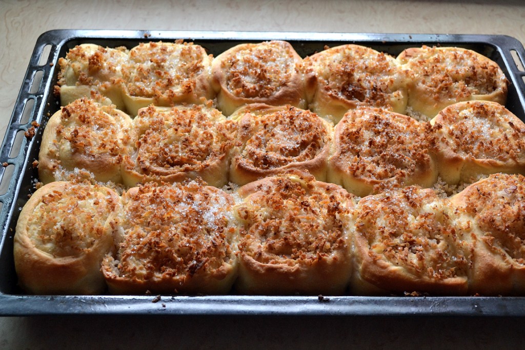 Remove from oven and sprinkle the remaining coconut on top of the rolls.