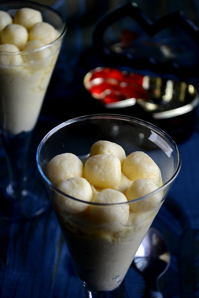 17. At the time of serving, layer the cream and rasgollas alternately in tall glasses and serve immediately.