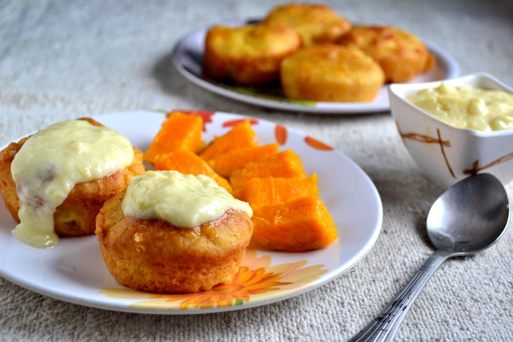 Savarin is an yeasted cake which uses a very rich dough which constitutes of eggs and butter. This month’s Daring Bakers challenge was hosted by Natalia of Gatti Fili e Farina and she challenged the daring bakers to bake Savarin. The dough is the same used for Rum Baba which is similar to Polish Babka. The savarin is usually baked in a bundt pan. When cool, it is immersed in a syrup. Then the crust is glazed with a jam. Then while serving the hole is filled with chantilly cream and fresh fruits. My actual challenge lied in replacing the eggs in the original recipe. Whenever I bake bread, I usually use curd and baking soda as the egg replacer. So for this recipe also I used curd. There were six eggs to be replaced in the recipe. As the given recipe made a huge savarin I halved the recipe and made 12 small savarins in muffin pan. I also used my new food processor to process the dough. As it is very sticky it will surely be very hard to make it by hand. With food processor it the kneading was done within 5 minutes. I also made a vanilla cream with china grass/ agar agar to serve the savarin with. As good strawberries are hard to get here, I served it along with mangoes and it was absolutely delicious. The texture of the cake turned out so nice and I am so so happy to have successfully replaced the eggs. I am linking this to yeastspotting