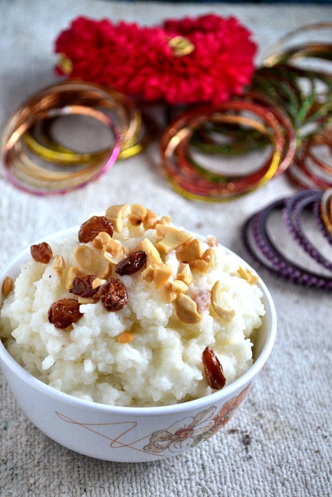 Ingredients: Raw Rice/ Ponni Pacharisi-1 cup Kalkandu/ Rock Candy-1 cup Water-3 cups Milk-2 cups Ghee-3 tbs Cashew-3 tbs Raisins-2 tbs Cardamom Powder-1/2 tsp Procedure: 1. Wash and soak rice for 30 minutes. 2. In a heavy bottomed vessel, add rice and water. Bring it to boil. 3. Reduce flame to medium and cook until all the water is used up. 4. Now add milk and keep on stirring until the rice is mushy. Keep flame low and cover vessel and cook. 5. When all the milk is absorbed and the rice is mushy, it is ready for the next step. 6. While the rice is cooking, mix rock candy and 1/3 cup of water in another pan and bring it to boil. 7. Switch flame to low and keep on stirring until the candy melts completely. 8. Add this hot syrup to cooked rice and mix well on medium flame. 9. Heat ghee in a separate pan and add cashew and raisins. 10. When golden add it to rice and stir well. 11. Remove from flame. The rice may look little thin but when it cools it comes to correct consistency.