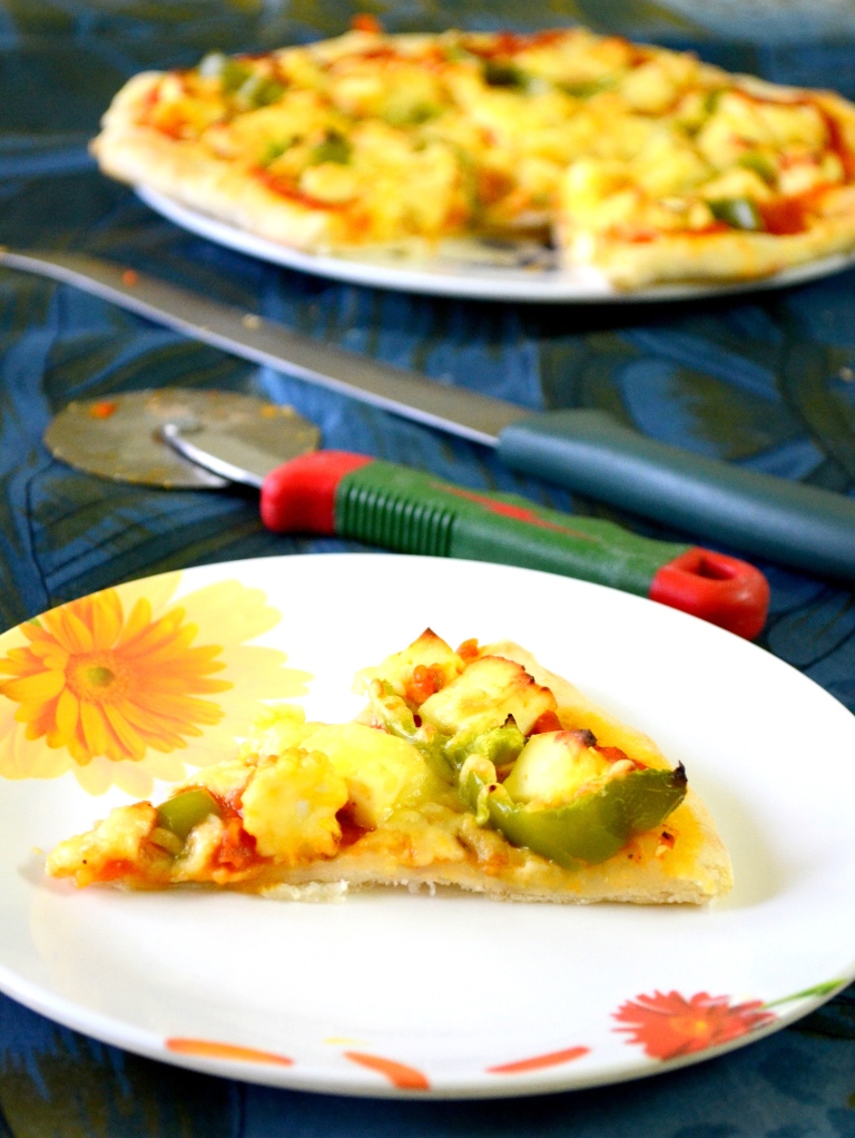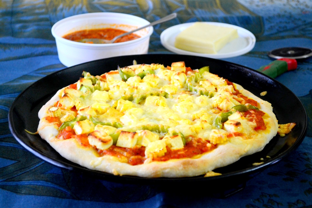After the dough comes back to room temperature, it is time to roll it out and assemble the pizza. Have the toppings, sauce and cheese ready before starting it out. I used paneer, capsicum, baby corn and sweet corn as toppings. You can add onions, sliced tomatoes, mushrooms or any other topping you wish. Add generous amounts of cheese for a delicious pizza. For baking, if you are using a baking stone, then you need to preheat your oven to its maximum temperature setting for 1 hour before baking the pizza. But as I don’t have a baking stone, I preheated my oven for 250C for 15 minutes before baking it in a round tray.