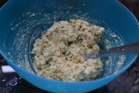 1. Mix hung curd, paneer, salt, garam masala, red chilly powder, green chilly, coriander leaves, bread crumbs and besan in a bowl. The dough will be very sticky.