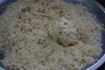 4. Drop one portion of the dough on the bread crumbs and roll to coat.