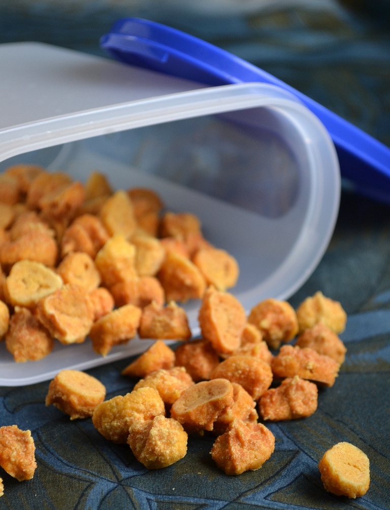 Pinch small portion and place on a greased tray. Sun dry or oven dry and use it in curries and gravies.