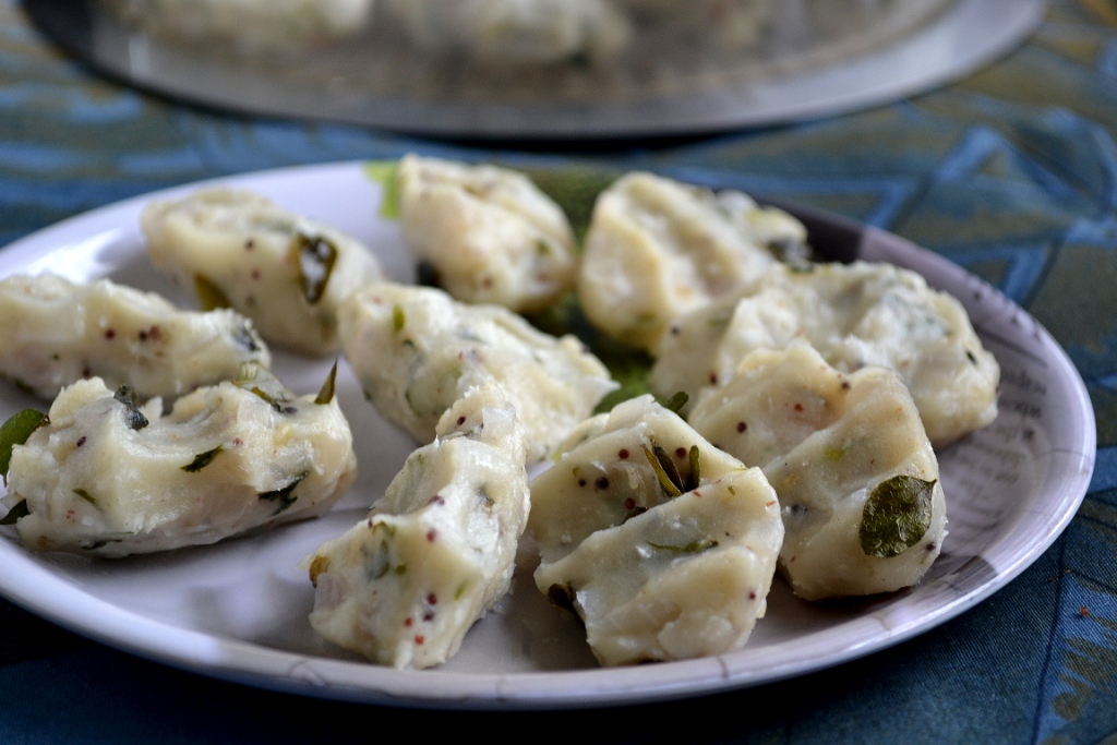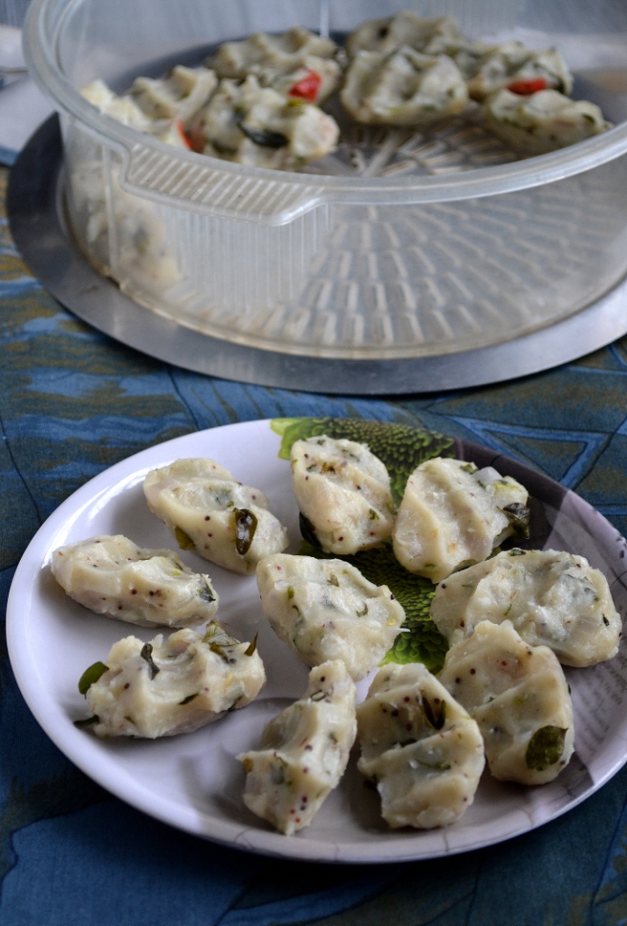 For the last two days I have been posting dumplings and today is the third one under Dallying with Dumplings for the Blogging Marathon #30 Week 2. As per instructions given by Srivalli, we need to use three different types of cooking for the three days. So for the first day I made deep fried Turkish dumplings and for the second day I made boiled Italian dumplings. And for the third day I am going with a Tamil Nadu special, kozhukkattai which is steam cooked. Those who don’t know about kozhukkattai, here is a small introduction. It is a dumpling made with rice flour. We either add ingredients to the dough and steam cook it or make outer dough with rice flour and fill it with savory or sweet fillings. These are also either boiled or steamed. There are so many varieties of kozhukkattai and today I give you my favourite spicy kozhukkattai. They are soft and spicy and are apt for evening snacks.