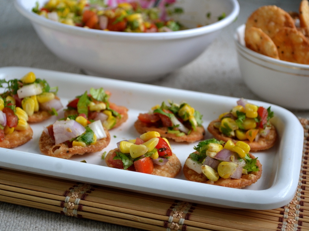 For the third day of Blogging Marathon #31, week 3, this is my final post under Kid’s Delight theme. Home made papdis are very easy to make and they make a great base for chaats. You can make a simple salad, top it on a papdi and your kid will love it. If you add some chutneys and sweet curd, then you get the dahi papdi chaat. I love these types of chaats. And to make my daughter relish this I added her most favourite ingredient to the salad- sweet corn. She loved it very much. I made the salad before I went to pick her up from the bus stop and as soon as she came home and got refreshed, I served her this colourful platter and she was so happy. I am linking this to Kid’s Delight – After School Bites hosted by Nisha and started by Srivalli. For the recipe and step wise pictures of home made papdi click the link.