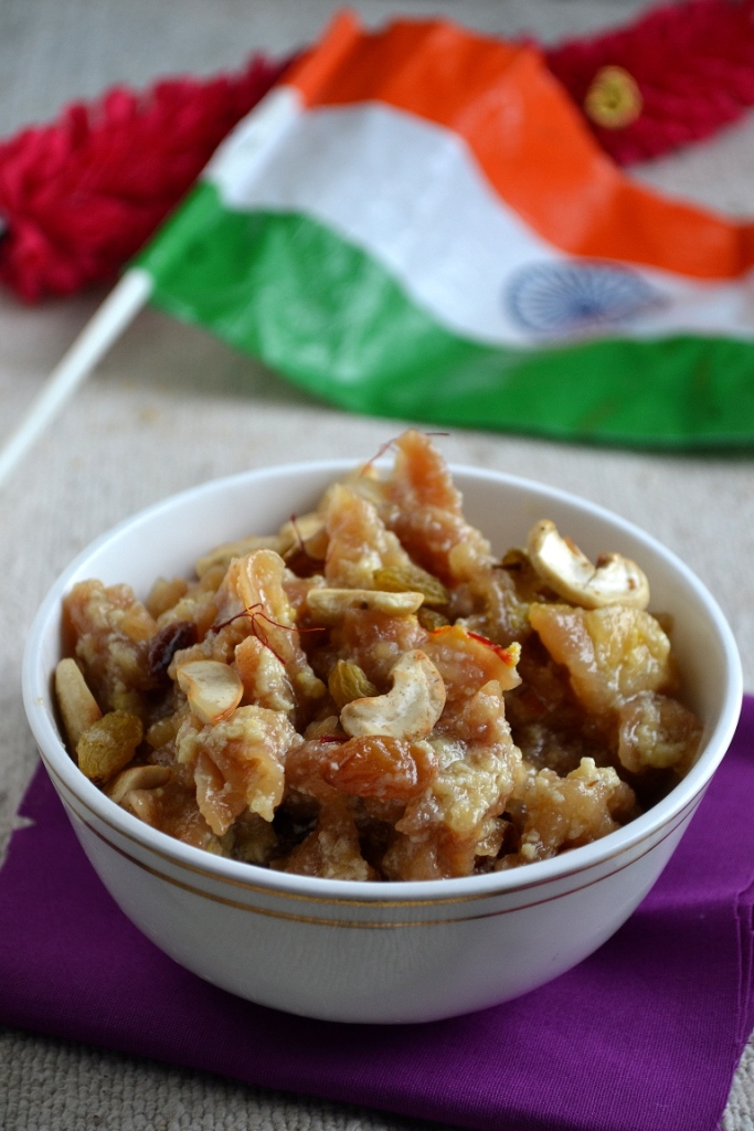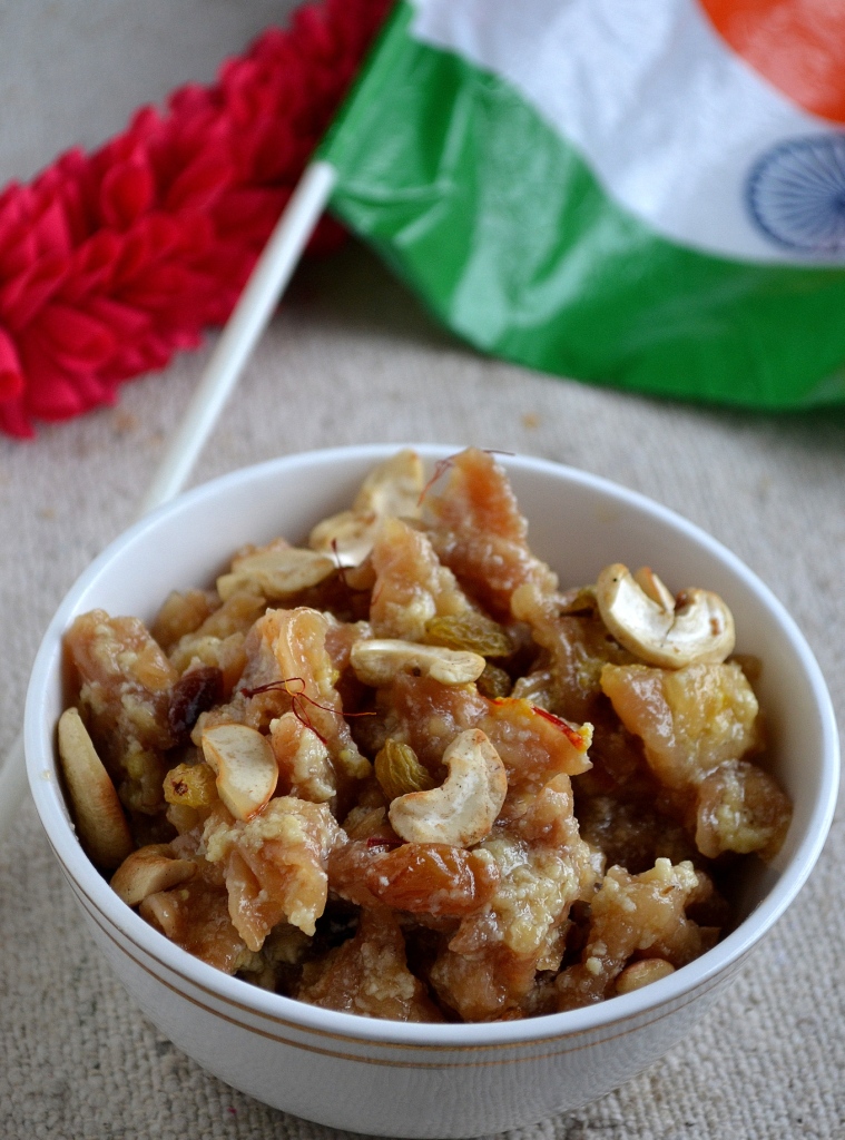 Let us celebrate this Independence Day with a delicious Hyderabadi Sweet Meethe Ghoday. For this month’s Indian Cooking Challenge Srivalli as per Mirelle’s suggestion announced this sweet from Monas’s blog. After the Hyderabadi biryani yesterday, it would be so nice to have an authentic Hyderabadi sweet today. I have never heard of this sweet until Srivalli announced it for this month’s challenge. This sweet involves making cute little flowers with wheat flour/ maida and then frying it and again cooking it in sweetened milk. Mona’s snaps were superb but I think I overcooked the flowers so you will not be able to see the shape after cooking. But taste wise it was absolutely delicious. It reminded me of semiya payasam but a richer version. You need to make these flowers the previous day itself and should let it dry overnight before deep frying them. The only task in to make the flowers. I took nearly 1 hour to make the flowers but the other steps are quite easy when the flowers are ready. I made it a little thick with a little milk in the final product. PK loved it so much. As for Sruti, she is not a great fan of payasam so I didn’t even ask her to try. May be she needs to grow up to like these type of dishes.