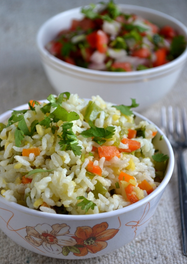 For the final post in Mexican cuisine I selected this simple rice and served it along with salsa fresco. The combination was a great hit. Sruti had it as it is while we paired it up with a rajma gravy I made. It was fabulous. The addition of vegetables and lentils made it a filling meal. I came across this recipe at taste.com. Whatever Mexican recipe I saw was loaded with cheese or butter. This rice was a variation from other loaded with goodness. And as it was a simple dish too, I made it for our lunch two days back. Cook rice ahead and let it cool for a while before adding it to the vegetable mixture so that the rice doesn’t turn mushy. Basmathi would be best but as I was out of stock, I used the regular Ponni rice. Cook rice accordingly to the type being used. I had to use 3 cups of water to cook this rice but for others the quantity may differ. Water is not at all added to the vegetables so the vegetables retain their bright colour. Cook on medium to low flame until done. Please resist the temptation to add water as it will completely spoil the look of this rice.