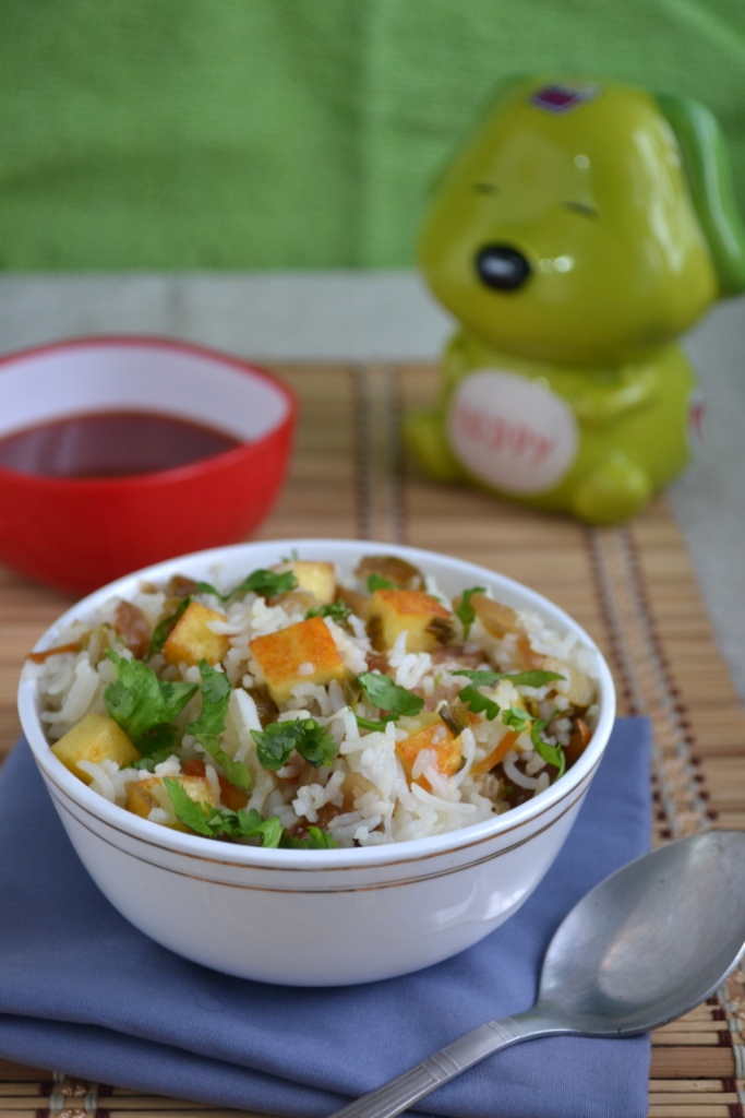 As part of Blogging Marathon photo exercise, I made this Paneer Fried rice. Pavani of Cook’s Hide Out, took a snap and posted it in the group page along with the setting of camera she used. The other members were supposed to take a snap with the same settings and details. Though my snap didn’t resemble the snap by Pavani, but still it came out nice. This is the basic fried rice recipe I always make but the addition of paneer cubes gave it an interesting twist. My daughter as well as PK love the tiny paneer cubes I add to my dishes. So I was sure that this fried rice will also be a hit. And yes they both loved it. I served it with tomato ketchup and the dinner was quite satisfying.