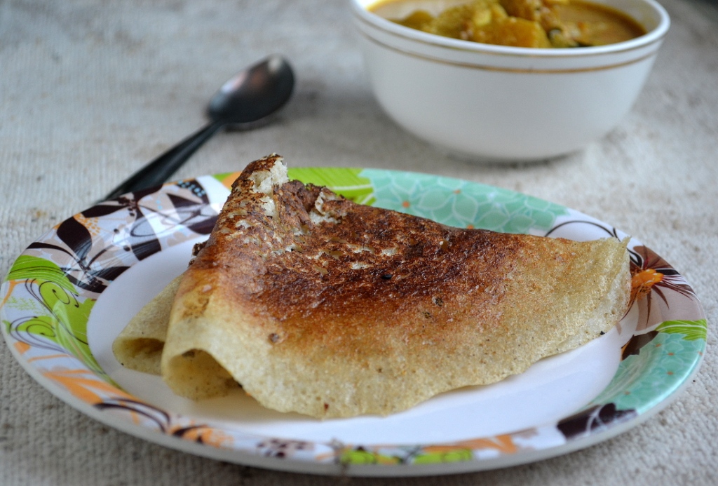 As I mentioned earlier, I have been experimenting with different types of dosas with flours to avoid rice. This is one of the dosa which my family likes very much. Using jowar instead of rice increases the nutrition in dosas. To know more about the nutritional facts of jowar read this article. It is quite easy to make. I buy jowar flour from Nilgiris. But if you want you can also buy the millet, soak it for 4-5 hours and grind it in wet grinder. I will try it and be posting an update later. The other ingredient used is urad dhal. It is ground just like we grind for the normal dosa. Then the flour is added and is fermented before making dosas. I made a Srilankan curry for yesterday’s breakfast. It was a very delicious and filling breakfast. This dosa has to be cooked on medium flame as it browns very fast. If you use high flame you will surely end up with a burned dosa.