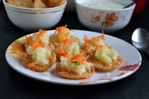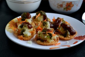 Now comes the alphabet D in the A-Z theme of Blogging Marathon #32 under street foods theme. Dahi papdi chaat has been in my to do list for long. A few weeks back I made some papdi at home ( for the step wise recipe click on link). I made corn papdi chaat (click on link for recipe) which every one in my house enjoyed. And next I tried this dahi papdi chaat and PK loved it so much that he gobbled plate after plate. There is no recipe for making this chaat. You add your favourite ingredients as topping for the papdis and finally top it with sweet cur and sev. You will never ever want to go to chaat shop again if you make it at home. I used carrot and boiled potato as the topping. You can also use boiled chick peas or any other lentils as topping. Green chutney and sweet chutney along with sweet curd is a must. You can also add onions but I completely forgot about it and remembered only while serving. They add a nice crunch and spiciness to the dish.