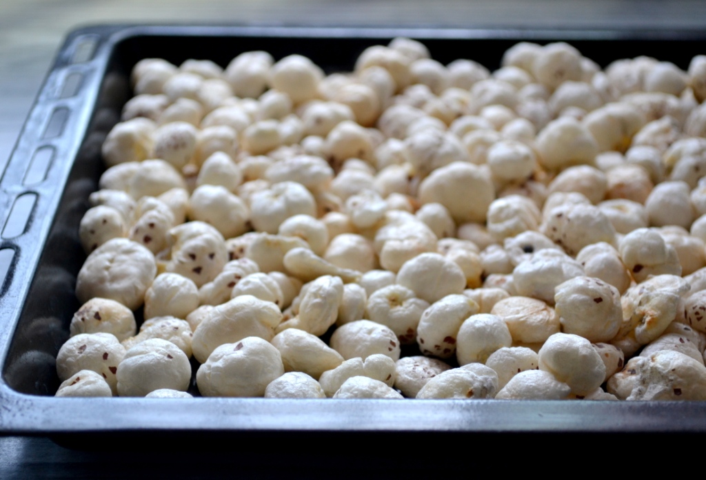 There is no particular recipe for this. Mix the lotus seeds with a tbs of oil, salt and red chilly powder and roast it in a 200C preheated oven until the seeds turn golden. Remove from oven and allow it to cool. though they seem to be soft when hot, they will become crunchy when cool. This is perfect to have while watching movies or TV. Enjoy…
