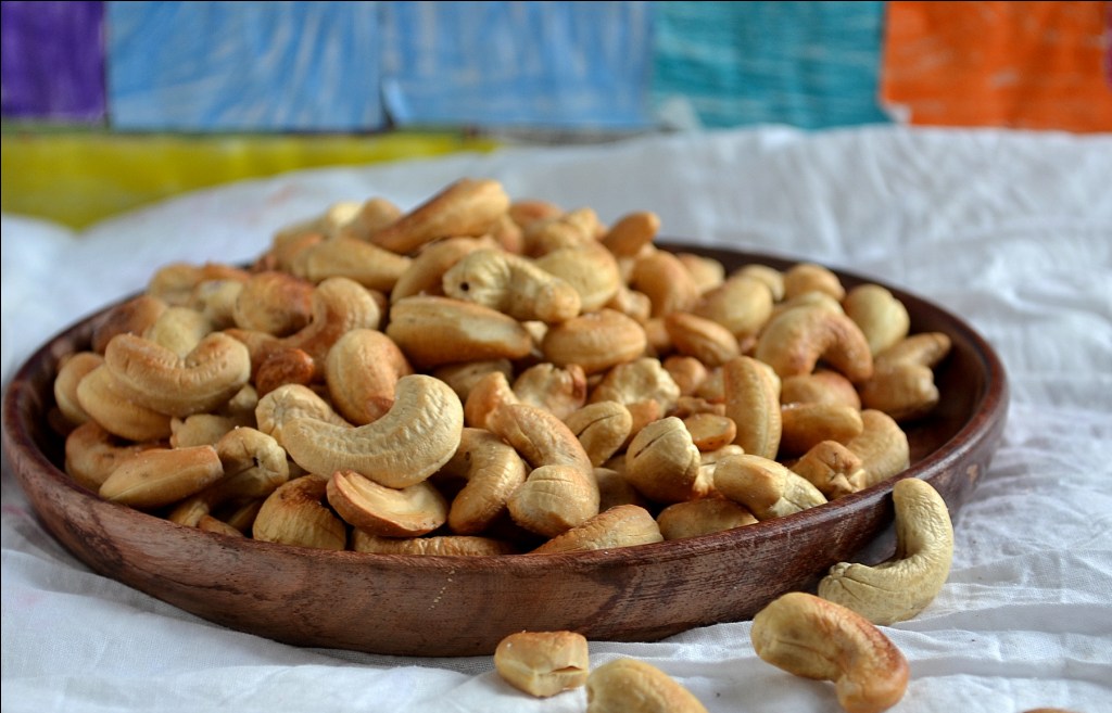 My daughter loves roasted cashews. But what we get at bakeries is full of chilly powder and it is very hot. So to make a plain salted version of those roasted cashewnuts, I tried this at home. Instead of deep frying the nuts, I opted for a more healthier method – I baked them in oven. It took just a tsp of oil to get these crispy crunchy cashew nuts and Sruti liked it so much.