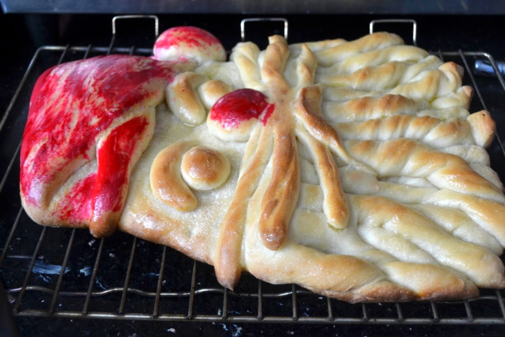 For the Home Baker’s challenge, I made two recipes from the recipes suggested by Priya. One being the Snowmen Butter Cookies, the other one I chose was Challah. Challah is a Jewish braide bread relished on Sabbath. It consists of eggs and that gives a fluffy bread. I have made Eggless Challah in braided form before and I was searching for other options to shape the bread. Recently I came across the Santa Claus bread in one of the groups. I am sorry I forgot the blogger but I searched for a detailed post and came across one in Taste of Home. The shaping was so much fun and the end result was awesome. My daughter loved it. The bread itself turned out super soft and the texture was very nice. You can use this recipe and braid the dough for an authentic finish.