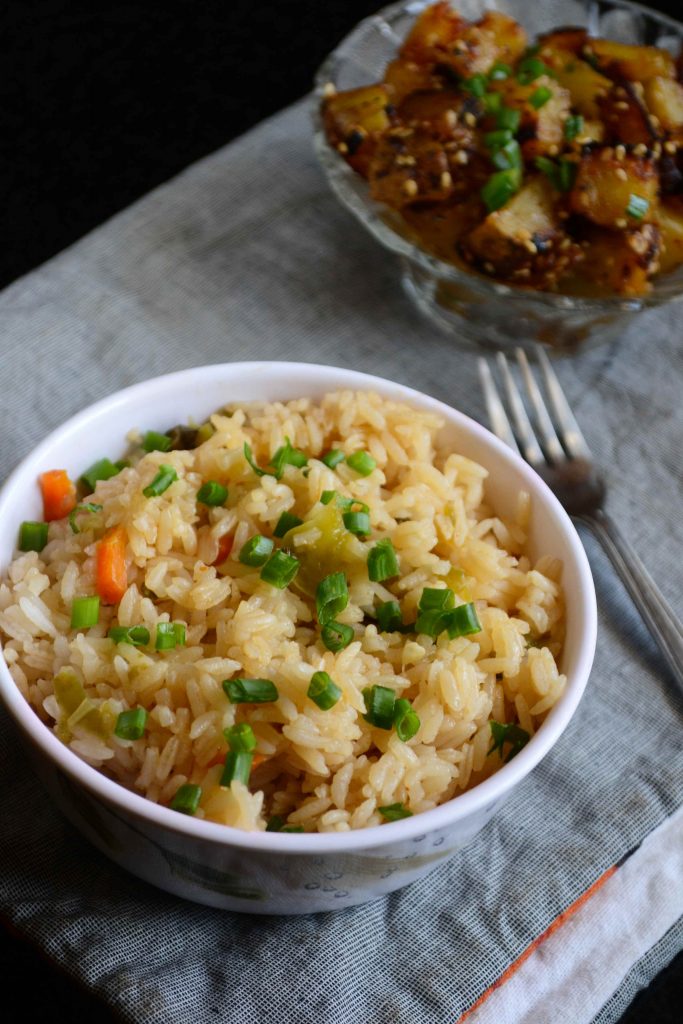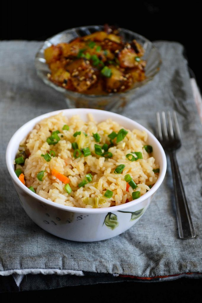 Today has been a busy day. This is my third post for the day. Don’t forget to read Cream Cheese Frosting and Devil’s Food Cupcakes posts. I am sure you will like it. This post is part of the monthly BM for which I am doing one pot dishes this week. For this theme I have been so creative and have tried different recipes so far. Don’t be confused by the name of this pulao. When I was listing out recipes, I just had an idea. Why not incorporate the flavours of fried rice in pulao. Fried rice cannot be termed as one pot meal, as we need to cook rice separately, sauté the veggies separately and finally combine both in a pan.