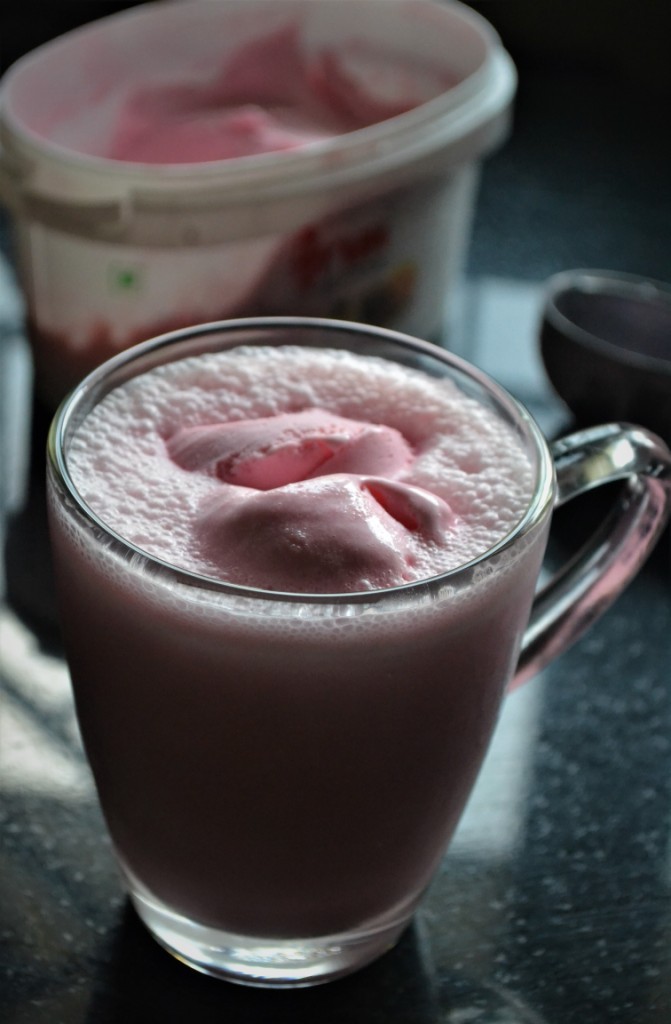 Being on vacation and going through the hottest period of the year, my daughter wanted something chilled everyday last month. So I stocked a large box of strawberry icecream. And also I always stock my refrigerator with boiled milk so that I could whip her something in a jiffy. I also have a habit of buying milk essences like rose milk, badam milk and strawberry milk. When added with milk and sugar and chilled these taste so good. When I decided to take up the drinks for Kid’s Delight, I had all the ingredients ready. It was party for Sruti everyday as I made nearly six types of drinks for last month and this month. If you don’t have the milk essence, then use clear essence and a few drops of food colour.