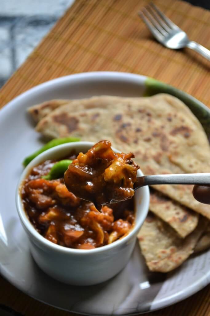 I just couldn’t believe that Madurai can become so chilly. We are shivering and always keep our doors closed to stay warm. Sruti is still disappointed because she was expecting a proper winter. Really! In Madurai! She need to come down to earth. As we are experiencing chilly weather here, which we are not at all used to, both of us are down with severe cold. And I try to feed her something warm to feel better. And coincidentally, I took the theme Winter Warmers for this week BM. Two weeks back I made this saucy gobi manchurian for her. On that day, I added milk so the final dish was lighter in colour. Today I made it again and served it with some flaky parathas. Today I skipped the milk so the manchurian is on the darker side. Comparatively Sruti loves todays version. So next time I will skip the milk, but I have added it in the recipe in case you need it.