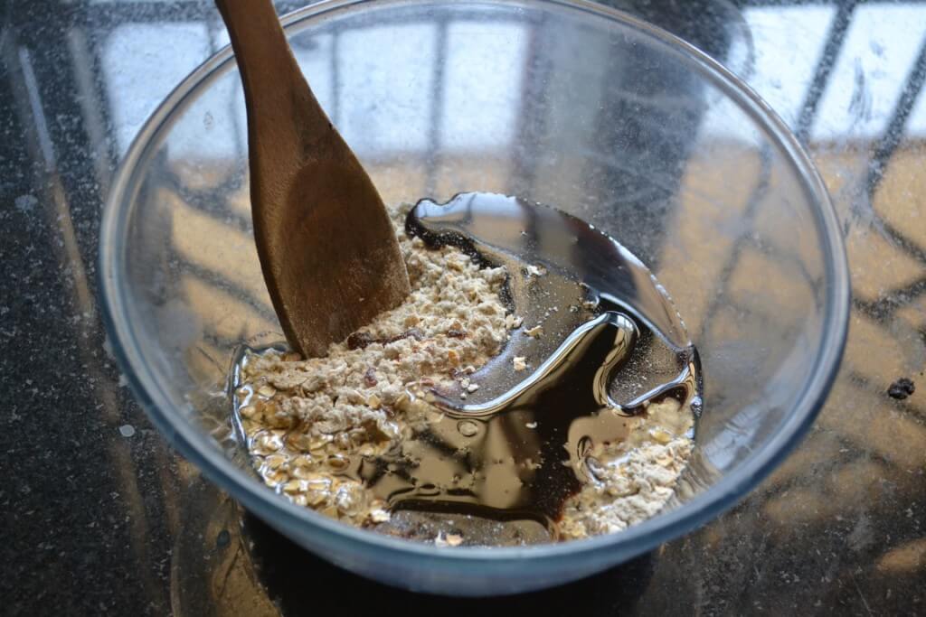 - Add in the coconut oil and jaggery syrup and mix to form a thick dough.