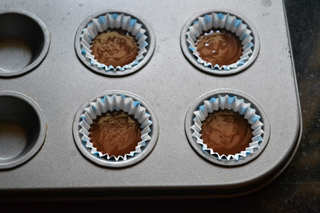 - Melt the remaining chocolate and pour it on the peanut butter mixture. Be careful not to overfill the cups. Now tap the tray to level the top.