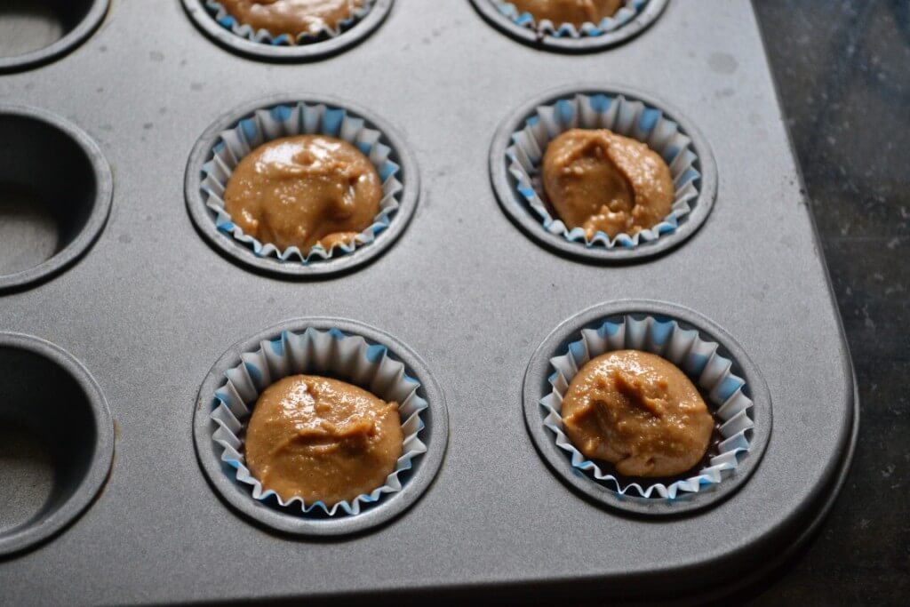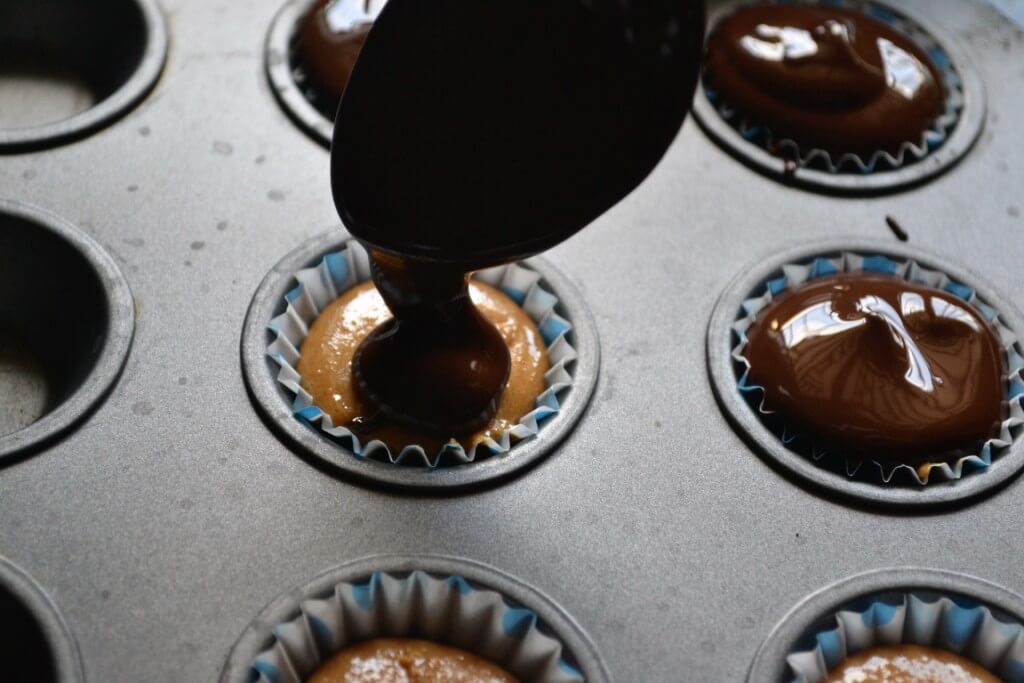 - Remove the cupcake tray and add peanut butter to the chocolate. It should be upto 2/3rd of the cup. Tap the tray again.