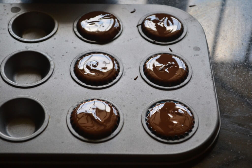 Melt the remaining chocolate and pour it on the peanut butter mixture. Be careful not to overfill the cups. Now tap the tray to level the top.