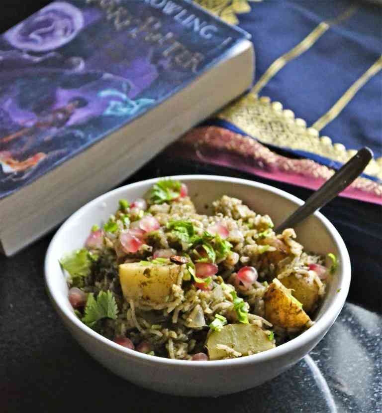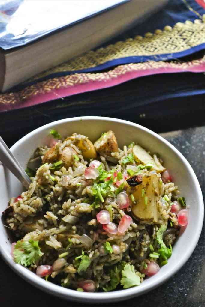aloo, pomo arils and that flavour packed chutney – what a great combo to come together as a pulao !