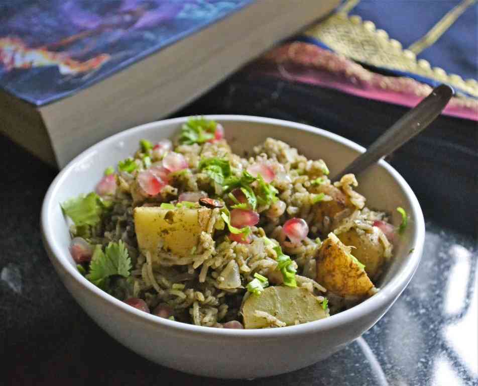 The first time I made it, I made it for myself as Sruti went to school. It was so delicious, so I didn’t want her to miss out on this. So I made it again on the weekend and as expected she loved it as she is a hardcore potato lover. And I had to make it thrice more before asking her to stop with it as I needed to prepare the other dishes for the BM. Some recipes used anardhana, but as I didn’t have any and I don’t get it here in Madurai, I used some fresh pomegranate seeds for topping. I also couldn’t source baby potatoes while making this, so I used larger potatoes, peeled and cubed. The combination of herbs, potato, spices and rice makes it a filling flavoursome meal.
