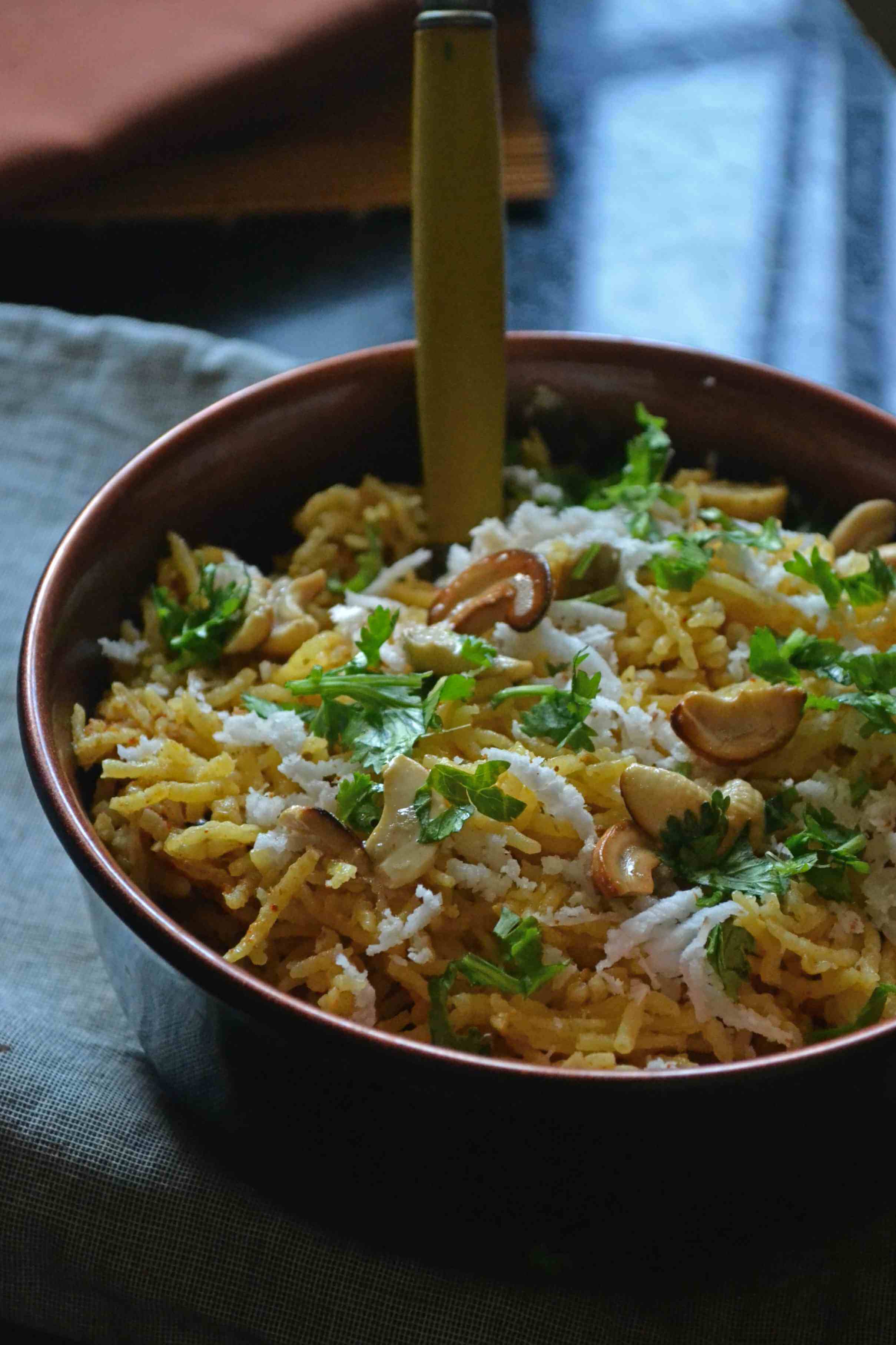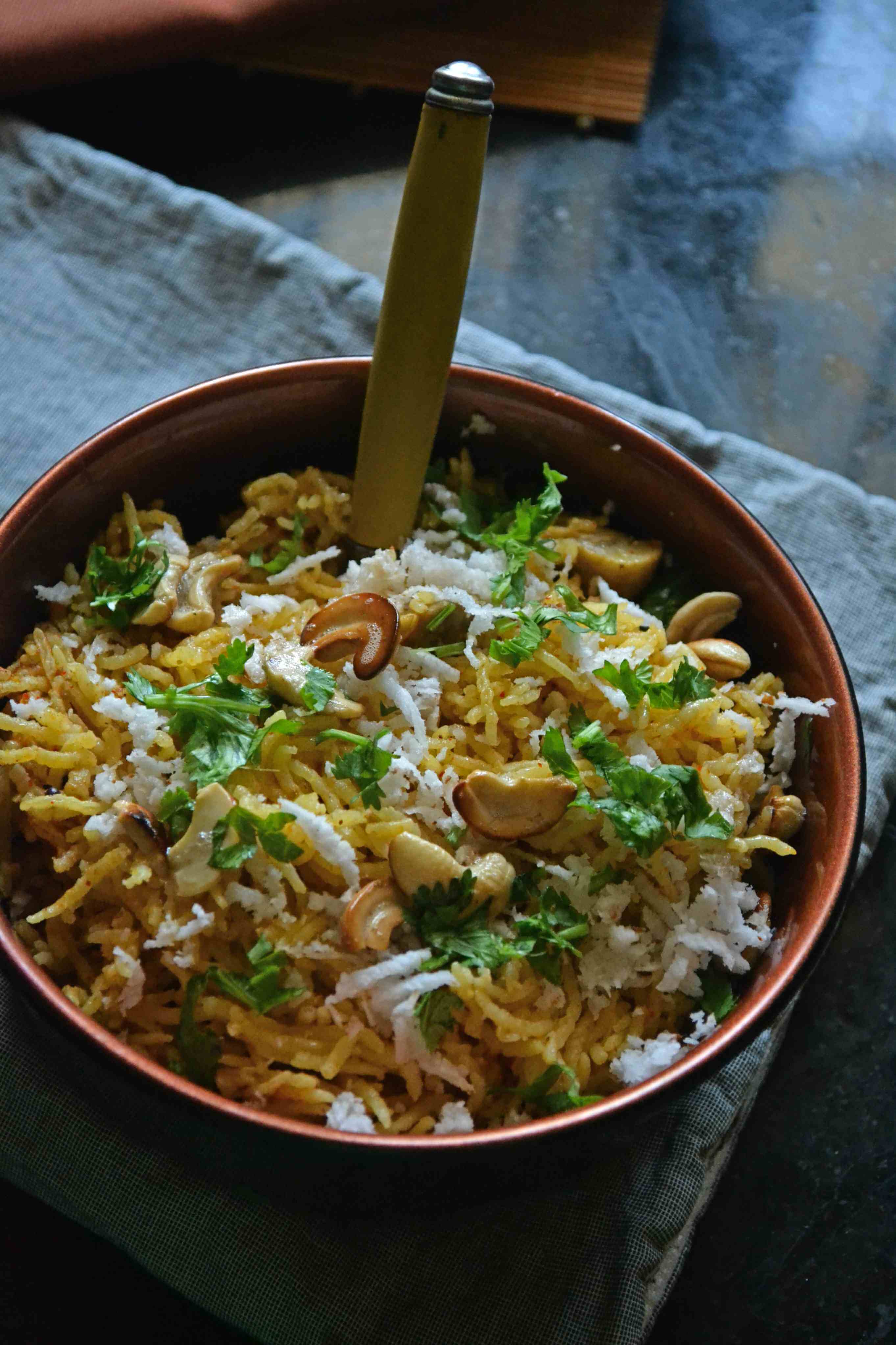 Slightly fluff the rice with a fork, garnish with roasted cashew, coconut and coriander leaves and serve hot.