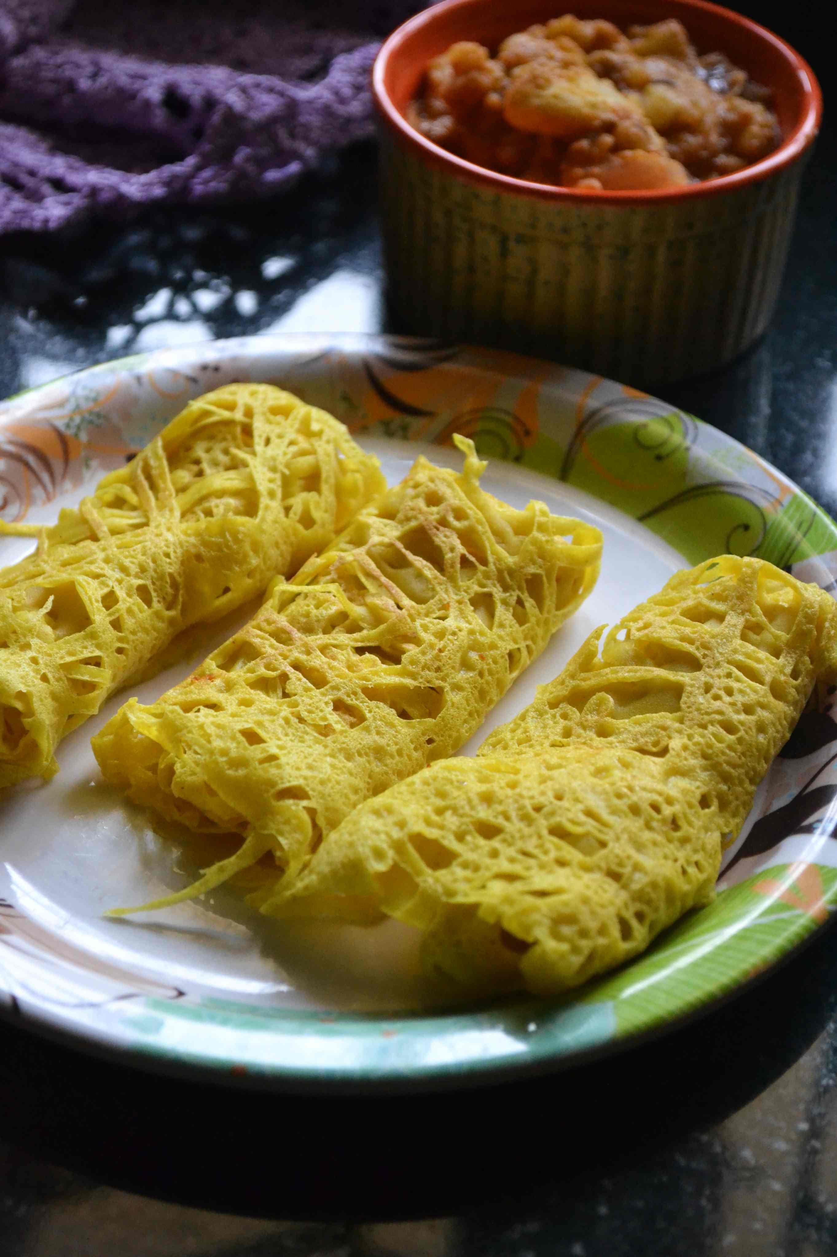To make roti jala, a special mould with five nozzles is used. But no worries if you don’t have the mould. You can use the ketchup bottle or a normal water bottle to make it. If using a water bottle, you need to make four or five holes on the cap so that the batter falls as strings. The making of the crepes needs some practice to get the shape right. I made five crepes and only three ended up like lacey crepes. The other two were like lumps but still Sruti had them without complaints. I guess with regular practice, the crepes can be made beautiful. The batter is like the maida dosa batter we make, but it has coconut milk in it, which makes it full of flavour. I served it with a spicy potato curry and Sruti loved it. She loved the curry more than the crepes and she didn’t find the crepes that interesting except for the beautiful presentation. turmeric is added to the batter to give it the bright yellow colour and minimum oil is needed to cook the crepes. As you know, I love experimenting international recipes and this one was quite interesting. But if you ask me whether I would repeat it, my answer would be no.