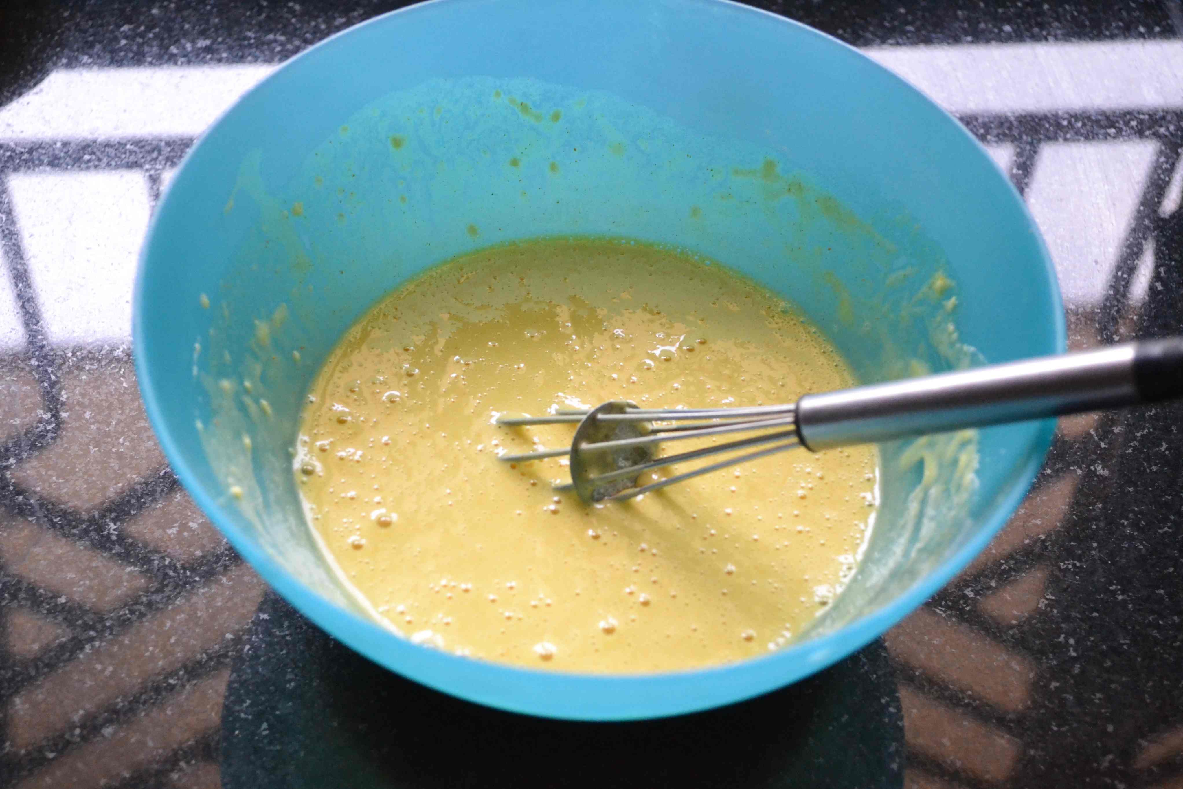 - Add coconut milk and egg and mix well to make a batter. Add water if needed to make it a slightly thin batter.