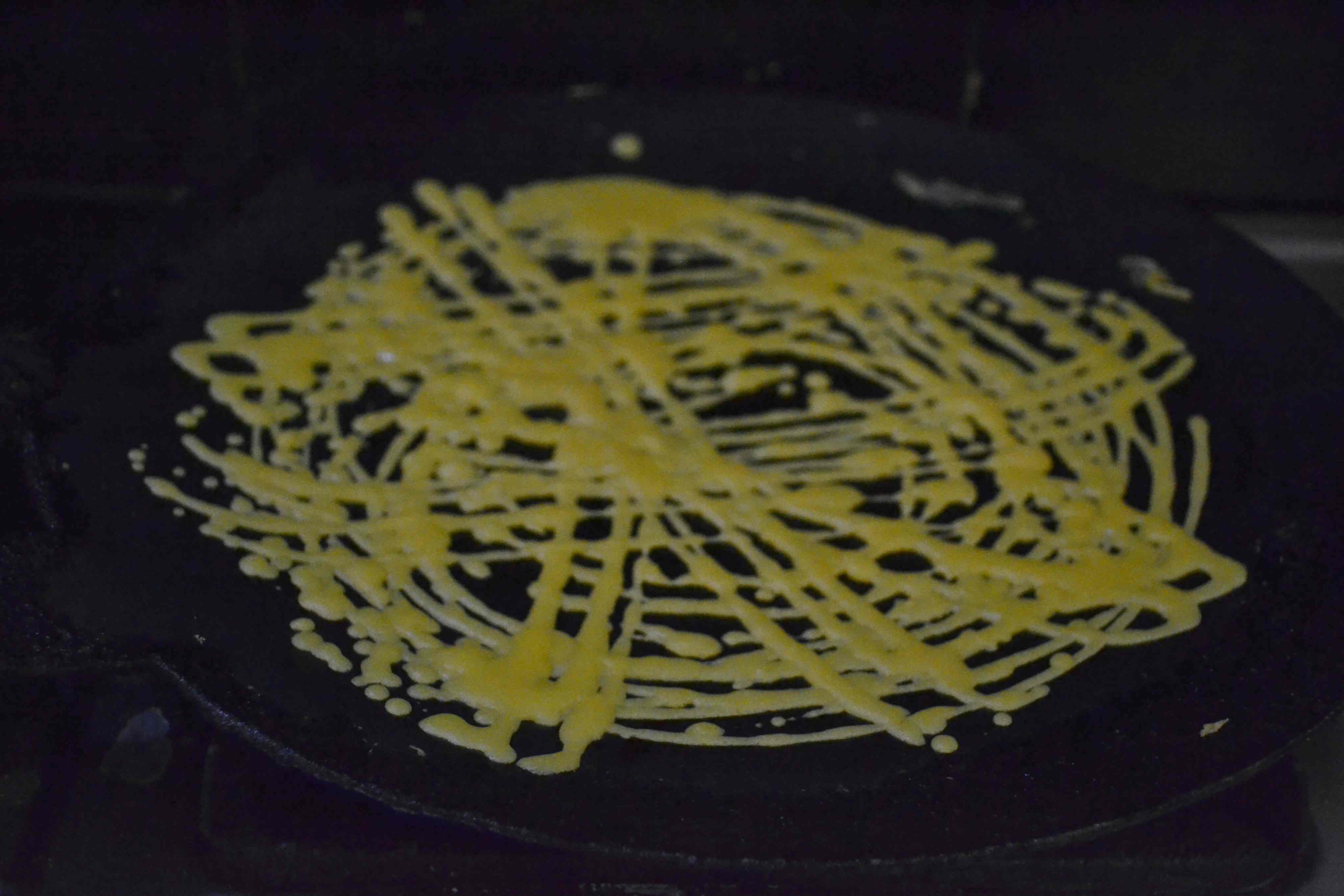 - Heat a tawa, apply oil with a tissue and pour the batter by inverting the bottle. Keep on making a circular pattern so that the crepe looks like a net.