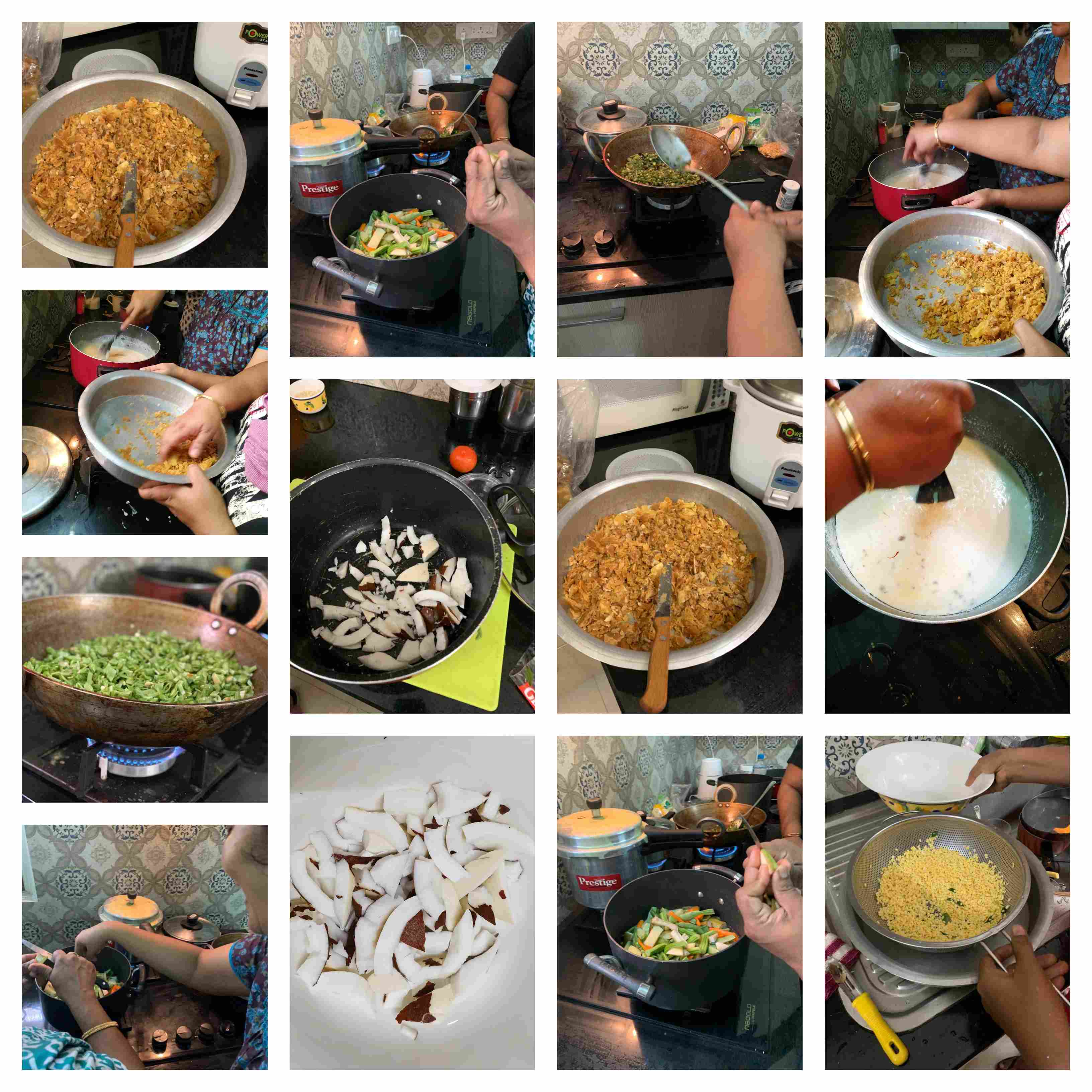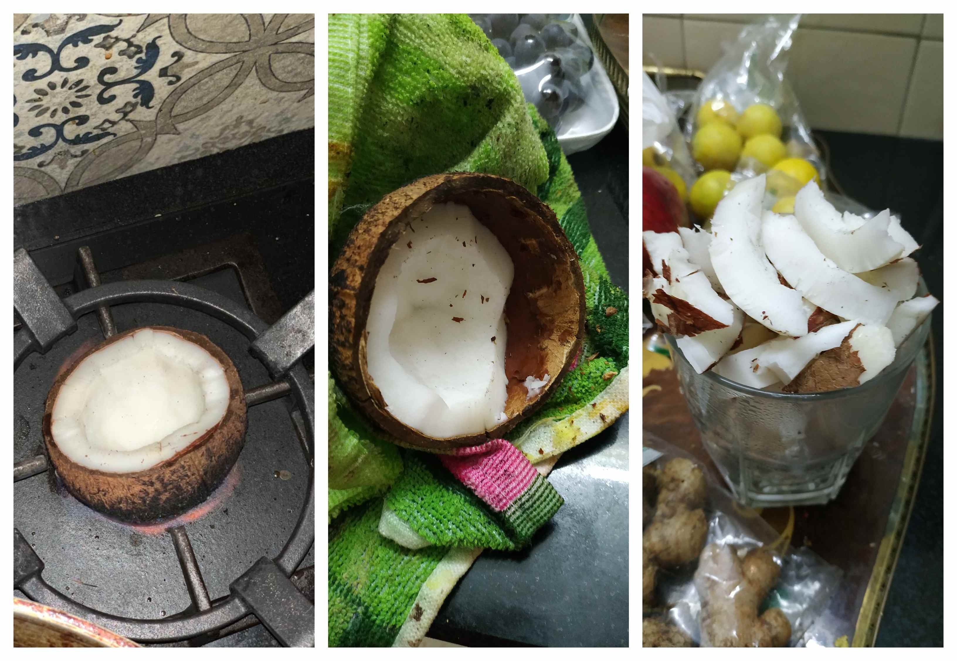 Removing coconut from the shell was my duty and the knives in the kitchen were too thin, I thought they would break when I tried to remove the coconut. At that time I remembered an Insta video on removing coconut flesh from the shell easily and decided to try it out. I know it was a risk, but I couldn’t come up with a better idea as I had two coconuts and so four coconut halves staring at me. Check out the collage below, the idea worked perfectly. Place the coconut along with the shell on the flame and wait until you see a gap between the flesh and the shell. Remove it from the stove, let it cool for a bit. Now use a knife to pry out the shell. It comes out without any problem. Something new tested in the kitchen and was quite a success.