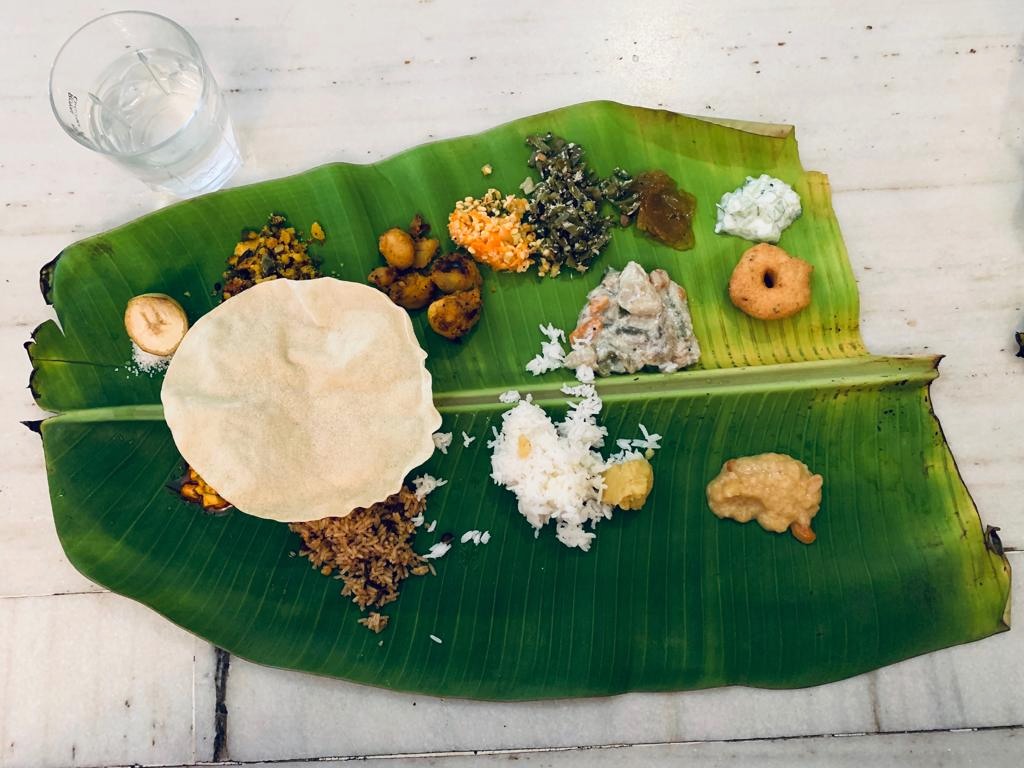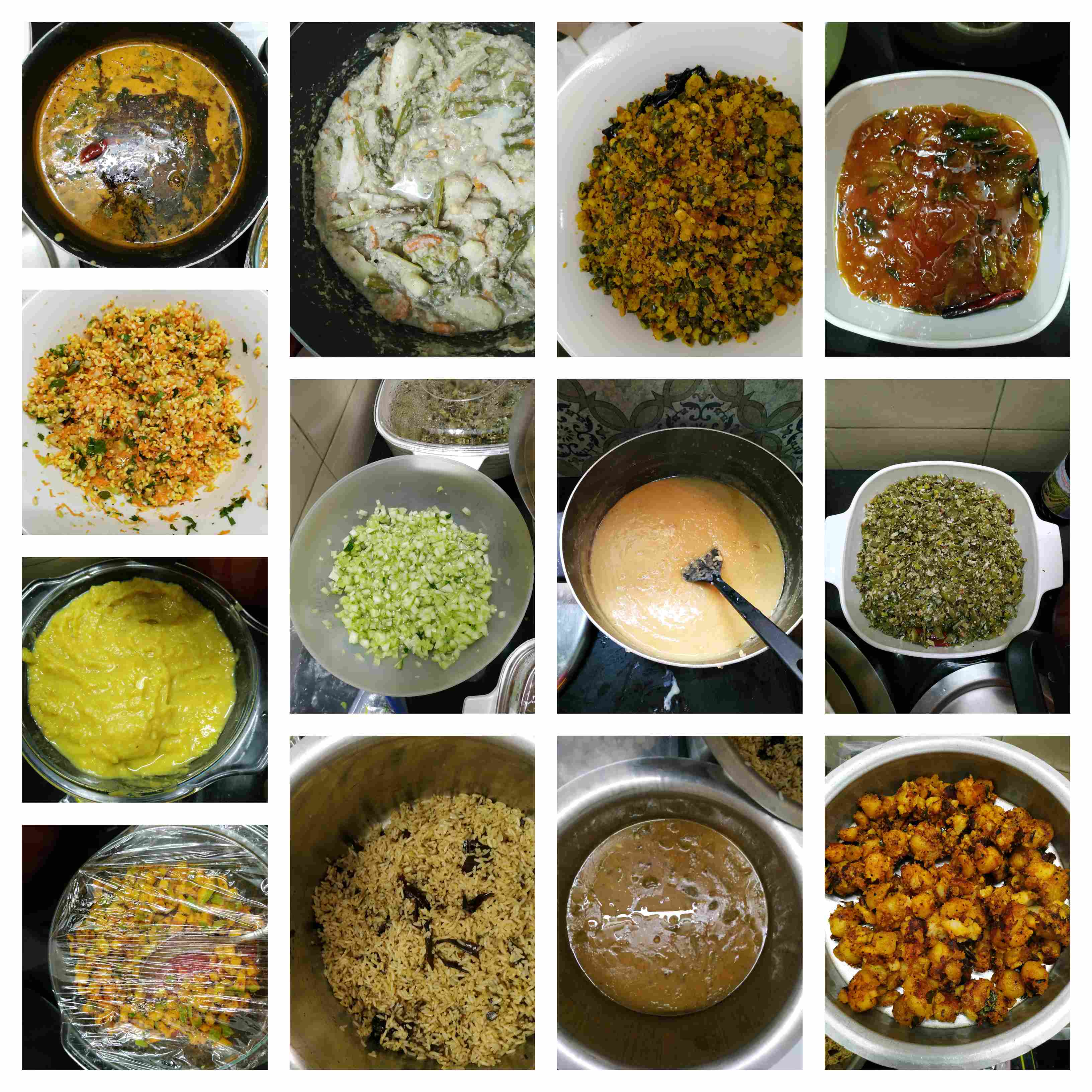 From left top – Sugar, Banana, Usili, Potato roast, Kosumalli, Avarakkai Poriyal, Avial, Sweet mango pachadi, Mango pachadi, vada, Akkaravadisal, Rice, Paruppu, Puliodharai, Pickle and Appalam. Sambar and rasam were served afterwards.