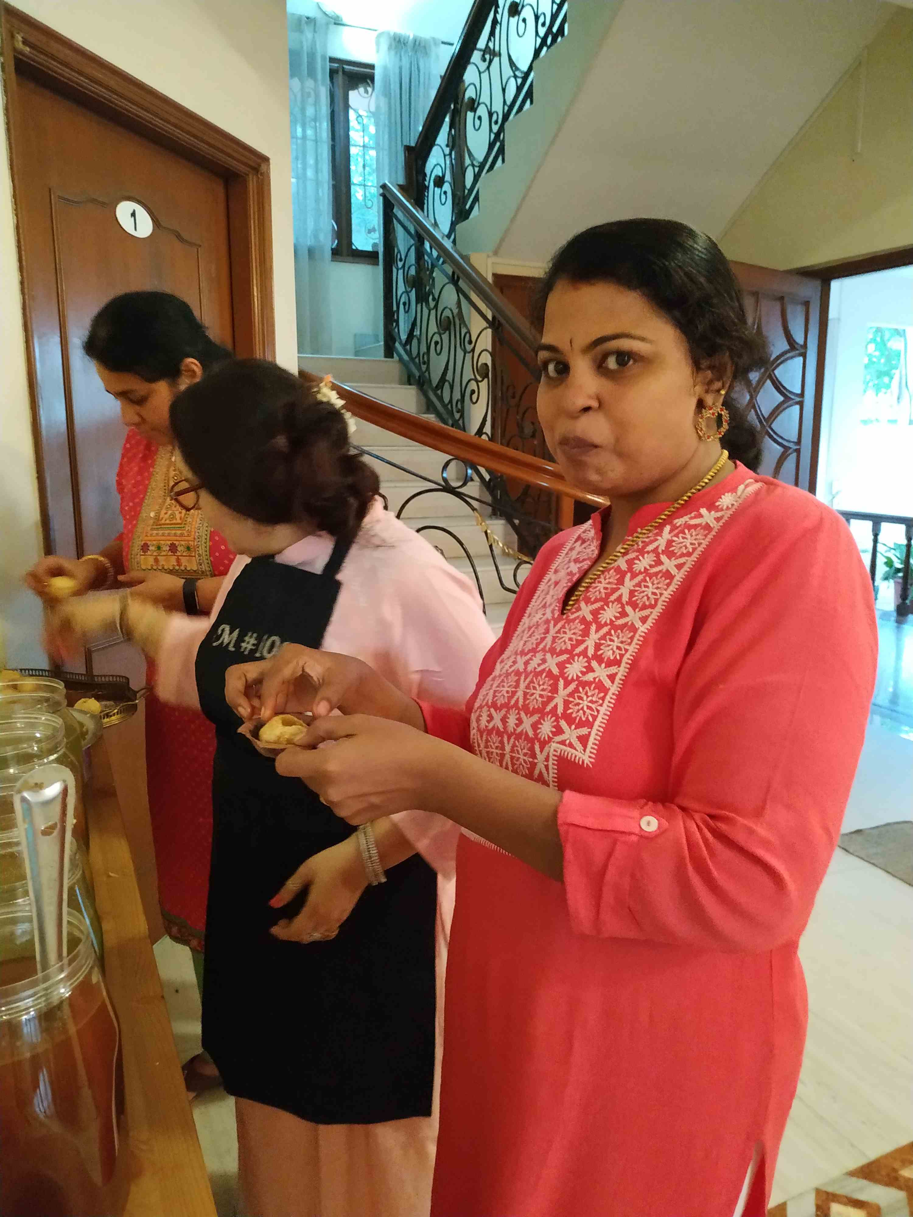 Vaishali getting ready to serve us pani puris. I enjoyed it very much. It was so much like having amma there. She used to sit with all the pani puri ingredients surrounding her and we use to sit in a neat row opposite to her. She would serve in a line and we used to wait until our turn came. Sometimes we become naughty and go before others for the next puri. When Vaishali served me the pani puri, I was really taken back to my childhood and felt mom was there serving me. Love you Vaishali!