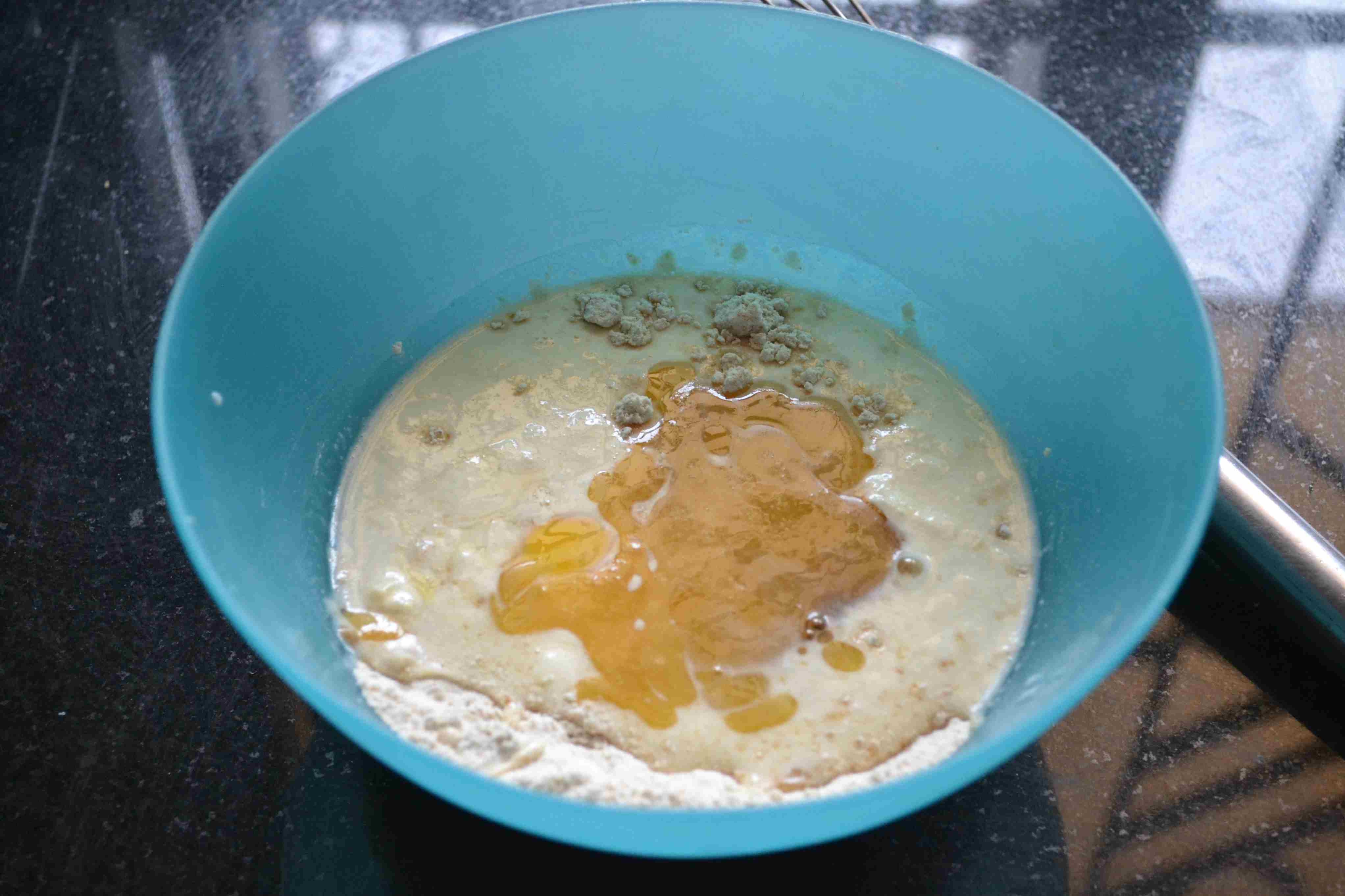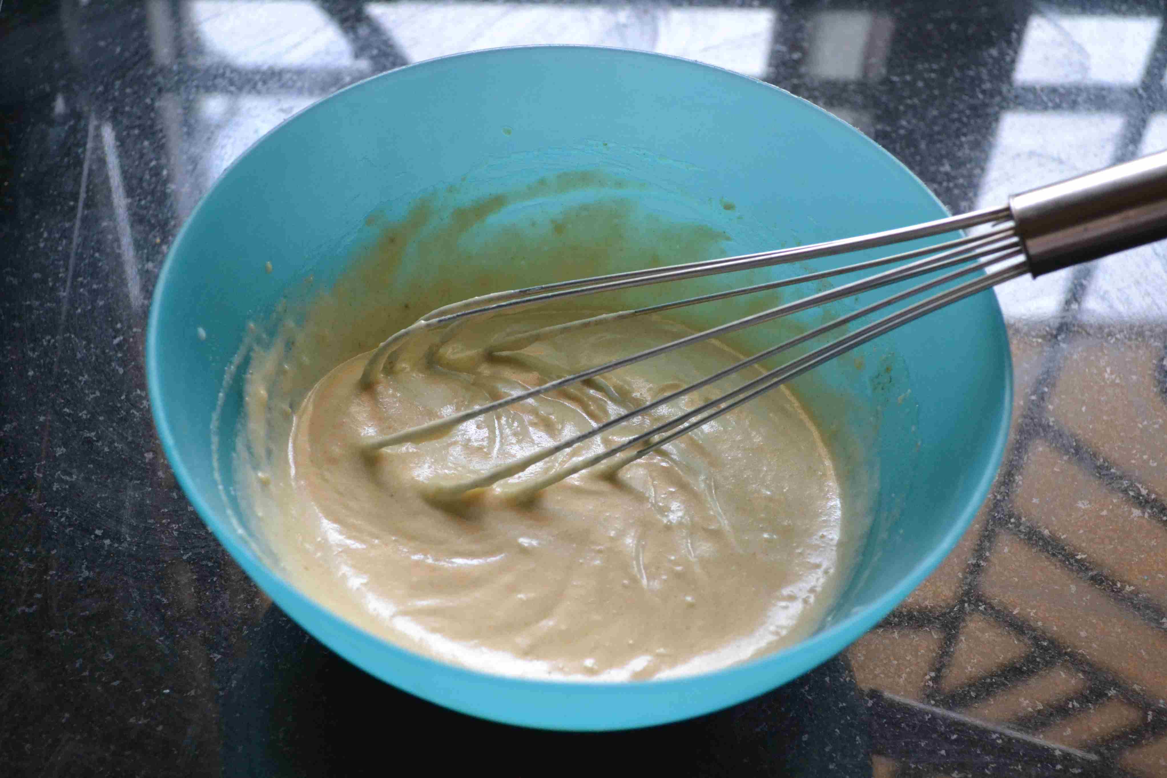 - Add in egg, milk, ghee and vanilla and whisk until a thick batter is made.