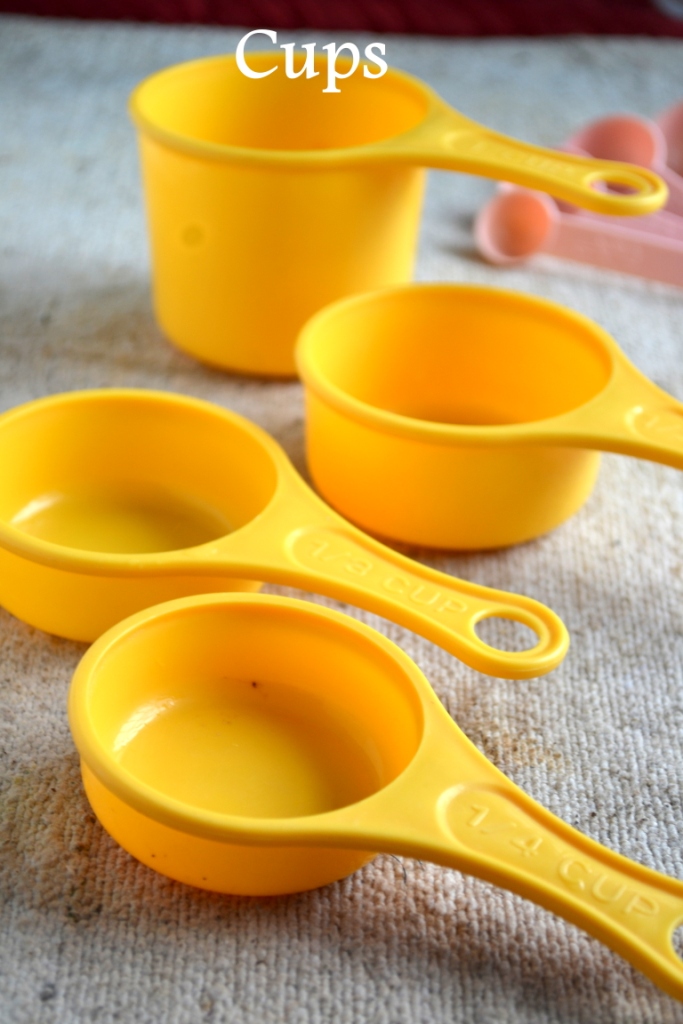 Next we will deal with cup measurements. The cups shown below are those I use in my day to day cooking. There are 4 cups ranging from 1 cup to 1/4 cup. I will give the equivalent weight of cup measures so that you can easily convert my recipes. For every ingredient the weight varies for one cup. I am trying to give you the weight of most used ingredients below.