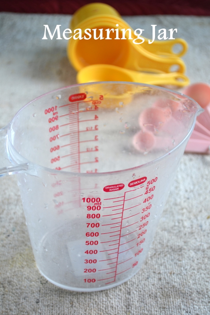 Having a measuring jar in the kitchen is useful in many ways. Measuring liquids is very easy when you have a jar. This jar measures up to a litre which is equal to 5 cups. Measuring milk, water and cream for baking is easier when you have this. But if you have only cups then 1 cup of any liquid equals 200 ml. You need to calculate accordingly.
